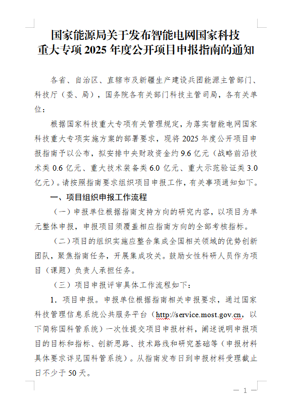 附件:國(guó)家能源局關(guān)于發(fā)布智能電網(wǎng)國(guó)家科技重大專項(xiàng)2025年度公開(kāi)項(xiàng)目申報(bào)指南的通知(國(guó)能發(fā)科技〔2025〕30號(hào))