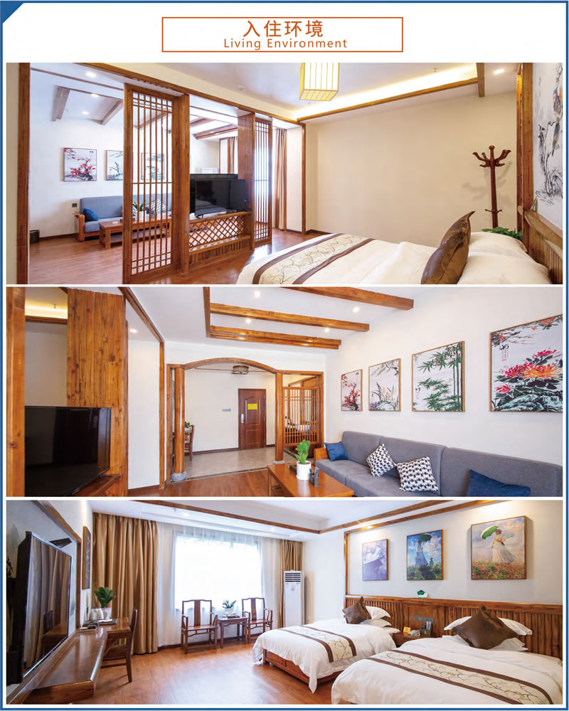 這里設(shè)施完備,環(huán)境優(yōu)美。占地70余畝,建筑面積23000余平方米,由多座湘西民族風(fēng)格的園林建筑群組成。院外依山傍水,院內(nèi)綠樹(shù)成蔭,環(huán)境優(yōu)美怡人,F(xiàn)有客房4棟,各類客房279間,中西餐廳可滿足500人同時(shí)就餐。大小多功能會(huì)議室、棋牌室、健身房、藍(lán)球場(chǎng)、羽毛球場(chǎng)等設(shè)施均有配備。