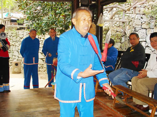 三棒鼓,唐代稱三仗鼓,約于明代傳入張家界,并逐漸成為群眾喜聞樂(lè)見(jiàn)的民間藝術(shù)形式。每年春節(jié),藝人們結(jié)伴走村串寨拜年,表現(xiàn)對(duì)象不分貧富,戶戶必到。如遇貧寒之家,表演者將別家贈(zèng)送的禮品相送,意在人人過(guò)節(jié)歡喜。充分體現(xiàn)出土家人熱情好客,心地善良的民族性格。對(duì)加強(qiáng)民族間團(tuán)結(jié)有一定的作用。三棒鼓 通常由三至五人組成,一人擊鼓唱詞,一人鑼鼓配樂(lè),一人;ò;ò羧,長(zhǎng)一尺,舞者左右 各執(zhí)一根,將另一根拋在空中,左右開(kāi)弓,擊打空中花棒使之不落地。也有以刀代棒,以五刀代三棒的技藝。鋼刀在空中歡跳,銀光閃閃,左右穿梭。技藝高強(qiáng)者,突然把刀拋得及高,來(lái)一個(gè)騰空飛腳,轉(zhuǎn)身外擺,繼續(xù)接刀上拋,令人眼花繚亂,不禁稱絕。打三棒鼓,通常有“鬧春耕”、“收割打場(chǎng)”、“慶豐收”、“拜年節(jié)”四套,分“鯉魚(yú)跳龍門(mén)”、“玉女穿梭”、“板巖漂灘”等項(xiàng)目。打三棒鼓技巧性強(qiáng),表演時(shí)需高度集中,用力適當(dāng),貫通一氣,并與演唱者默契配合。
