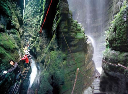 坐龍峽圖片 坐龍峽風(fēng)景區(qū)位于古丈縣河西鎮(zhèn),與“芙蓉鎮(zhèn)”--王村一水之隔。經(jīng)由300萬年大自然的風(fēng)吹、水蝕而成,一直隱逸于湘西茫茫十萬群山之中。它長約3500米,最大高差達(dá)300余米;寬處不足丈余,窄處僅容一人通過;谷內(nèi)絕壁縱疊,溪瀑橫懸,崖樹斜逸,異草遍坡。