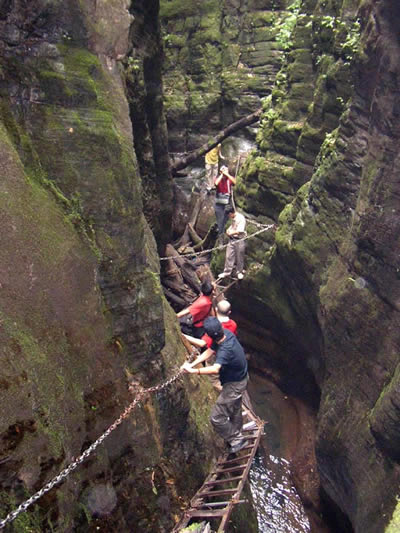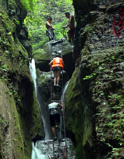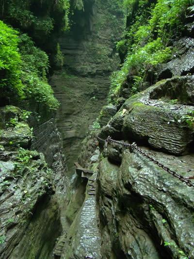 坐龍峽風(fēng)景區(qū) 坐龍峽擁有中國第一條特種游道。所有游道均建于峽谷深處,依山取勢,既經(jīng)細(xì)心雕琢聽卻又渾然天成。粗樸的板栗木棧道,可以讓你零距離的親近那一潭碧幽、聽聞山泉叮咚;精巧的跳墩,可以讓你媳戲流泉、觸感溪瀑;原質(zhì)的石坎道,讓你不得不調(diào)動全部的身心能量悉心攀援、感悟峽谷;有驚無險的鐵梯,讓你伴著腳下轟鳴的溪水,在驚怵中體味一份快慰。出口處的土家山寨,保留了古樸獨(dú)特的生活習(xí)俗。一塊臘肉就一口醇香的“苞谷燒”會讓你洗去所有的疲憊,在輕松中憨厚的主人向你講述過去強(qiáng)人出沒的故事......
