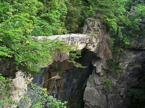 仙人橋又稱天下第一橋,坐落在猴子坡上、天子峰下的王爺洞對面。橋?qū)僮匀恍纬,長26米,寬1.5米,厚一米多,高約六七十 米,飛架在兩岸懸崖絕壁之上,鬼斧神工,惟妙惟肖,古人云:“天地可掬,此真天造也”。仙人橋為紅砂巖結(jié)構(gòu),兩端生有高大的黃山松和杜鵑樹,濃蔭掩映,極其美麗。橋的東頭還有自然形成的石級,人可順石級而下,走上天橋,下視萬丈深淵,令人頭暈目眩,非健壯者不敢逾越,旅游者無不贊嘆,說它是“天下絕景”。