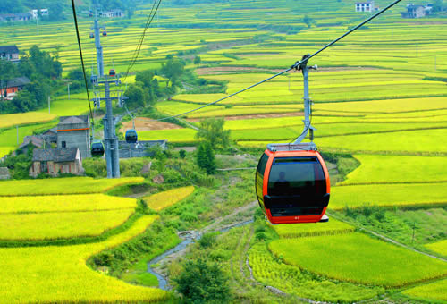 天門山索道途經(jīng)的美麗田園 天門山索道最大的亮點(diǎn)就是它的爬坡面支架的設(shè)計(jì) ,這個(gè)支架共有壓索輪96個(gè),托索輪16個(gè),它綜合了現(xiàn)代物理學(xué)、現(xiàn)代工程學(xué)、現(xiàn)代制造業(yè)中最先進(jìn)的理論和成果,應(yīng)用了世界最先進(jìn)的索道技術(shù),從而使這段索道總給人一種蕩氣回腸、氣勢(shì)沖天的感覺。