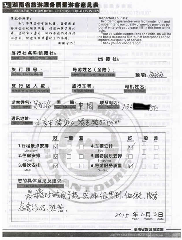 現(xiàn)在位置:首頁(yè) -> 西部國(guó)旅->旅游質(zhì)量反饋 -> 2015-6-3 北京吳先生一行四位貴賓 張家界、楊家界三日游