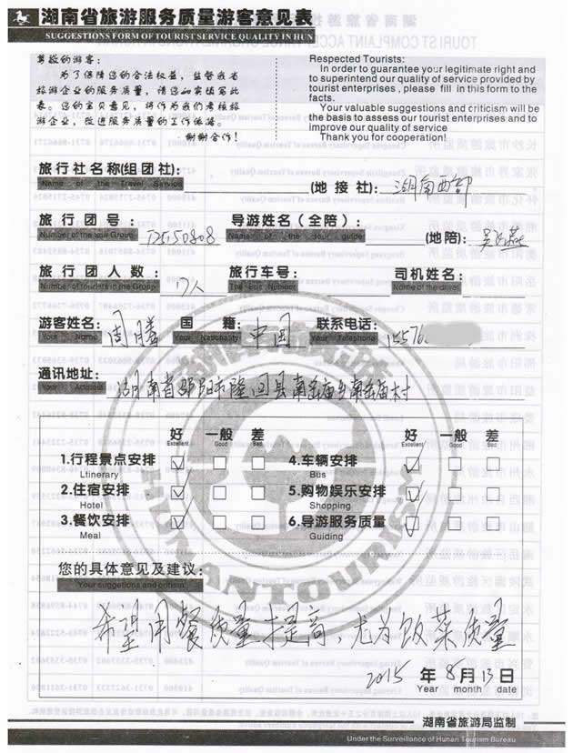 8月初,湖南邵陽(yáng)周先生一行17位貴賓與湖南西部(張家界)中國(guó)國(guó)際旅行社工作人員——小王取得聯(lián)系,經(jīng)過(guò)商談,雙方達(dá)成協(xié)議并簽訂旅游合同,于8月9日抵達(dá)張家界,開(kāi)始張家界之旅。此次行程是由我社優(yōu)秀導(dǎo)游——吳飛燕負(fù)責(zé)旅游接待工作,吳導(dǎo)在旅游過(guò)程中講解詳細(xì),客人也很滿(mǎn)意,在意見(jiàn)表上要求我們:希望用餐質(zhì)量提商,尤為飯菜質(zhì)量,我們感謝周先生為我社提出了寶貴意見(jiàn),謝謝周先生。同時(shí)也感謝周先生選擇湖南西部(張家界)中國(guó)國(guó)際旅行社,以及您對(duì)湖南西部國(guó)旅的信任與支持。我們會(huì)繼續(xù)努力,做好旅游接待工作。期待下一次與您的合作,祝您愉快!