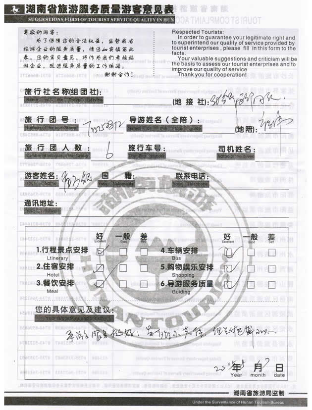 8月初,山西太原孟先生一行6位貴賓與湖南西部(張家界)中國國際旅行社工作人員——小吳取得聯(lián)系,經(jīng)過商談,雙方達(dá)成協(xié)議并簽訂旅游合同,于8月14日抵達(dá)張家界,開始張家界之旅。此次行程是由我社優(yōu)秀導(dǎo)游——褚偉負(fù)責(zé)旅游接待工作,褚導(dǎo)在旅游過程中講解詳細(xì),客人也很滿意,在意見表上寫道:導(dǎo)游服務(wù)挺好,謝謝周先生。同時也感謝周先生選擇湖南西部(張家界)中國國際旅行社,以及您對湖南西部國旅的信任與支持。我們會繼續(xù)努力,做好旅游接待工作。期待下一次與您的合作,祝您愉快!