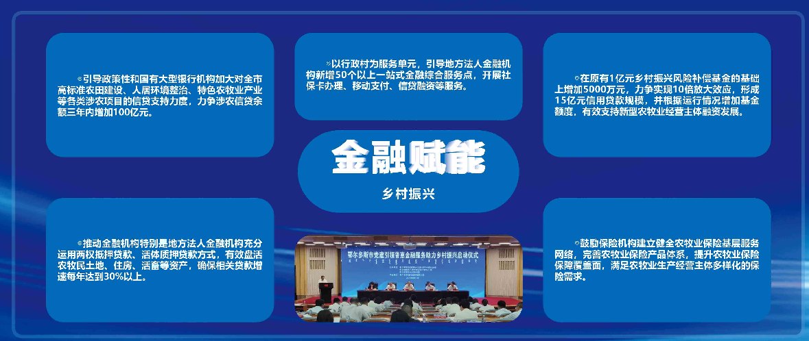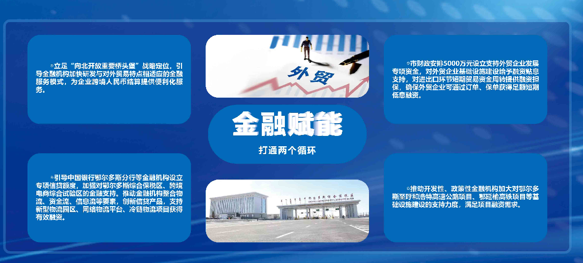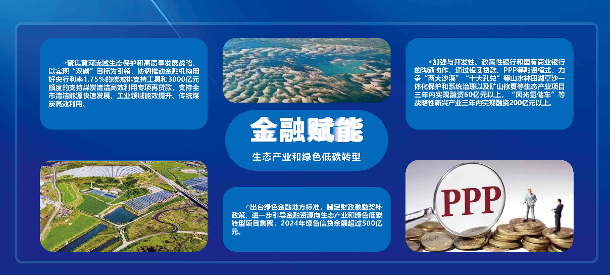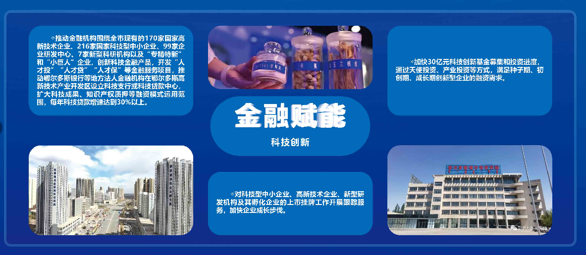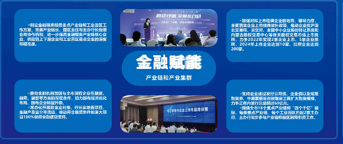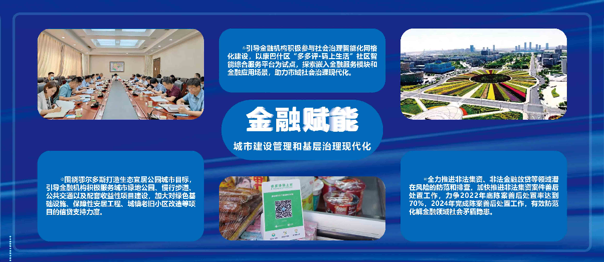 第三部分是重點(diǎn)任務(wù)。共十項(xiàng)。一是在賦能生態(tài)產(chǎn)業(yè)和綠色低碳轉(zhuǎn)型方面,以實(shí)現(xiàn)“雙碳”目標(biāo)為引領(lǐng),通過建立綠色金融地方標(biāo)準(zhǔn)、制定財(cái)政獎補(bǔ)激勵政策、運(yùn)用貨幣政策支持工具,推動金融機(jī)構(gòu)大力發(fā)展綠色金融,2024年綠色信貸余額超過500億元。同時,通過銀團(tuán)貸款、PPP等方式,支持山水林田湖草沙系統(tǒng)治理以及礦山修復(fù)等生態(tài)產(chǎn)業(yè)項(xiàng)目三年內(nèi)實(shí)現(xiàn)融資60億元以上,“風(fēng)光氫儲車”等戰(zhàn)略性新興產(chǎn)業(yè)三年內(nèi)實(shí)現(xiàn)融資200億元以上。二是在賦能產(chǎn)業(yè)鏈和產(chǎn)業(yè)集群方面,為每條重點(diǎn)產(chǎn)業(yè)鏈、每個工業(yè)園區(qū)匹配2家主辦行,制定金融精準(zhǔn)服務(wù)重點(diǎn)產(chǎn)業(yè)鏈和工業(yè)園區(qū)工作方案,完善產(chǎn)業(yè)鏈長、園區(qū)主任與主辦行長定期會商協(xié)作機(jī)制,提高金融服務(wù)深度和精準(zhǔn)度。常態(tài)化開展政金企對接、行長實(shí)地看項(xiàng)目、金融產(chǎn)品宣介等活動,推動符合融資條件的重大項(xiàng)目100%獲得金融信貸支持。力爭2022年實(shí)現(xiàn)2家企業(yè)上市、5家企業(yè)掛牌,2024年上市企業(yè)達(dá)到10家、掛牌企業(yè)達(dá)到200家。支持企業(yè)通過發(fā)行直接融資工具擴(kuò)大融資規(guī)模,力爭三年內(nèi)發(fā)行總量超過60億元。三是在賦能科技創(chuàng)新方面,引導(dǎo)金融機(jī)構(gòu)創(chuàng)新科技金融產(chǎn)品,開發(fā)“人才投”“人才貸”“人才保”等金融服務(wù)項(xiàng)目,擴(kuò)大科技成果、知識產(chǎn)權(quán)質(zhì)押等融資模式運(yùn)用范圍,三年內(nèi)每年科技貸款增速達(dá)到30%以上。加快30億元科技創(chuàng)新基金募集和投資進(jìn)度,通過天使投資、產(chǎn)業(yè)投資等方式,滿足種子期、初創(chuàng)期、成長期創(chuàng)新型企業(yè)的融資需求。四是在賦能普惠中小微市場主體活力方面,落實(shí)好普惠型小微企業(yè)貸款“兩增”目標(biāo),引導(dǎo)普惠型小微企業(yè)貸款利率三年內(nèi)下降0.6個百分點(diǎn)。推動市融資擔(dān)保公司通過規(guī)范業(yè)務(wù)經(jīng)營、提升核心資產(chǎn)質(zhì)量等方式,進(jìn)入自治區(qū)政府性融資擔(dān)保機(jī)構(gòu)名錄,實(shí)現(xiàn)與內(nèi)蒙古再擔(dān)保集團(tuán)、國家融資擔(dān)保基金和大型商業(yè)銀行的業(yè)務(wù)合作,拓展擔(dān)保業(yè)務(wù)范圍、增強(qiáng)可持續(xù)擔(dān)保能力。多渠道籌資設(shè)立5億元三產(chǎn)服務(wù)業(yè)發(fā)展基金,開展融資擔(dān)保、貼息和風(fēng)險(xiǎn)補(bǔ)償,將受疫情影響的商貿(mào)物流、批發(fā)零售、住宿餐飲等市場主體的綜合融資成本控制在5%以下。五是在賦能打通兩個循環(huán)方面,安排5000萬元專項(xiàng)資金,給予外貿(mào)企業(yè)融資貼息和擔(dān)保支持。引導(dǎo)中國銀行等金融機(jī)構(gòu)設(shè)立專項(xiàng)信貸額度,強(qiáng)化對鄂爾多斯綜合保稅區(qū)、跨境電商綜合試驗(yàn)區(qū)的支持。推動開發(fā)性、政策性金融機(jī)構(gòu)加大對鄂爾多斯至呼和浩特高速公路項(xiàng)目、鄂延榆高鐵項(xiàng)目等基礎(chǔ)設(shè)施建設(shè)的支持力度。六是在賦能鄉(xiāng)村振興方面,引導(dǎo)政策性和國有大型銀行機(jī)構(gòu)加大對涉農(nóng)項(xiàng)目的信貸支持力度,力爭涉農(nóng)信貸余額三年內(nèi)增加100億元。在原有1億元鄉(xiāng)村振興風(fēng)險(xiǎn)補(bǔ)償基金基礎(chǔ)上再增加5000萬元,力爭實(shí)現(xiàn)10倍放大效應(yīng),形成15億元信貸規(guī)模。推動金融機(jī)構(gòu)特別是地方法人金融機(jī)構(gòu)充分運(yùn)用兩權(quán)抵押貸款、活體質(zhì)押貸款方式,有效盤活農(nóng)牧民土地、活畜等資產(chǎn),確保相關(guān)貸款增速每年達(dá)到30%以上。七是在賦能普惠民生方面,實(shí)行“政府+企業(yè)”雙管家服務(wù)模式,在市政務(wù)服務(wù)大廳設(shè)立金融服務(wù)中心,提供金融業(yè)務(wù)咨詢服務(wù)。引導(dǎo)金融機(jī)構(gòu)在醫(yī)療、養(yǎng)老、創(chuàng)業(yè)就業(yè)等方面加強(qiáng)合作,進(jìn)一步提升便捷金融服務(wù)。推動各級政府為全市216.8萬城鄉(xiāng)常住人口購買政府救助保險(xiǎn),提供自然災(zāi)害、火災(zāi)爆炸、傳染病等方面的民生保險(xiǎn)保障。八是在賦能文旅消費(fèi)提檔升級方面,多渠道籌資設(shè)立3億元文旅產(chǎn)業(yè)發(fā)展專項(xiàng)基金,通過擔(dān)保、貼息等方式增加文旅產(chǎn)業(yè)有效信貸。推動金融機(jī)構(gòu)在文旅消費(fèi)集中區(qū)設(shè)立營業(yè)網(wǎng)點(diǎn)或ATM機(jī),滿足商戶和游客多樣化金融服務(wù)需求。推動金融機(jī)構(gòu)與文旅部門聯(lián)合發(fā)行特色文旅信用卡、文旅消費(fèi)券,給予一定折扣優(yōu)惠,提升文旅消費(fèi)活躍度。九是在賦能城市建設(shè)管理和基層治理現(xiàn)代化方面,圍繞鄂爾多斯打造生態(tài)宜居公園城市目標(biāo),引導(dǎo)金融機(jī)構(gòu)積極支持城市綠地公園、慢行步道、公共交通以及配套收益性項(xiàng)目建設(shè)。以康巴什區(qū)“多多評·碼上生活”社區(qū)智能綜